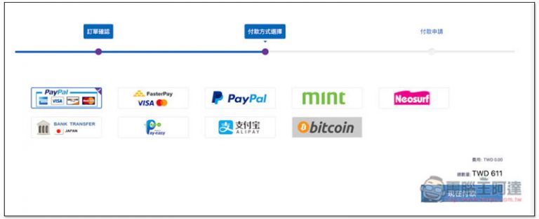 提供非常多樣的付款方式,有信用卡、PayPal、支付寶、bitcoin、MINT 等等: