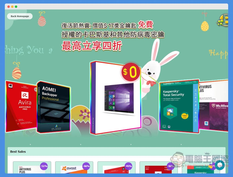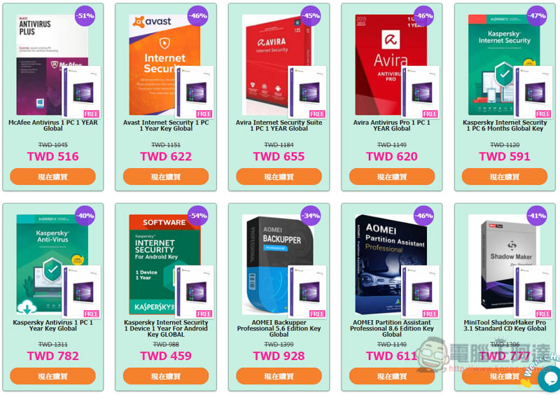 這次 Bzfuture 復活節熱賣的活動頁面排版設計很清楚,除了賣最好的名單外,也提供相關分類,如:卡巴斯基系列、AOMEI 系列等等,可以更容易找到想要入手的防毒軟體、電腦工具。每一套右下角都有註明 Windows 10 Pro OEM 免費,右上方是折扣百分比。