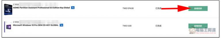 付款完,等訂單處理好之後,進到我的訂單頁面就會看到這筆,而軟體序號會放在右側的 “查看密鑰”,Windows 10 Pro OEM 也一樣: