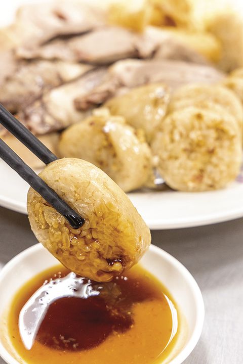 蒸好的大腸圈,看起來緊實,也油亮油亮的,飽滿米粒透著油蔥香氣,特色就是店家堅持用新鮮豬腸衣灌製,再跟豬內臟一起放在蒸鍋當中,所以還有豬肉的香味。這大腸圈其實就是糯米腸。建議可以先來一口原味的,再來試試店家的沾醬,巧妙各有不同,都是美味。