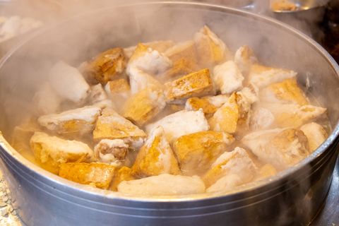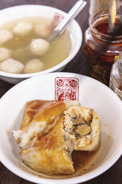 在基隆吃蔥油餅或是乾麵配餛飩湯、黑白切配大腸圈、米苔目甚至烏龍麵之外,我再介紹一個特別的「豆干包」。看起來像是淡水的阿給,實際上不同,三角豆干裡面塞入醃肉餡料,然後再用魚漿封口,品嘗到肉香與豆干、魚漿三合一的美味,相當花費手工現作的特色餐點。