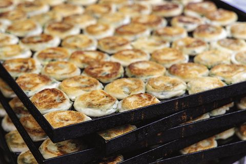 陳家早點就在大馬路邊,一靠近就看到外帶排隊的人潮,我的習慣是先內用再外帶。店內一直是相當忙碌的景象,最外面是幾個年輕師傅忙碌的將麵團壓成餅狀,麵團混入了蔥花及豬油等調味,先快速油煎到8分熟,再送入烤爐烘烤,香味讓排隊的人都伸長了脖子,希望可以趕快輪到自己:這樣外脆內嫩香氣十足的蔥油餅,早就成為基隆人最愛的早餐。