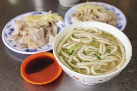 烏龍麵不論是湯的或是乾的都很推薦,我個人麵食類大都愛吃乾的,店家會詢問是否要加醬汁,熱麵帶出油蔥酥及調味的芹菜末香氣,烏龍麵條口感Q彈、扎實、不軟爛,這是我愛的口味。黑白切建議一定要點吸滿湯汁的油豆腐及吉古拉,還有天梯及小肚都處理得極好,配上薑絲再加上生辣椒醬,很夠味。