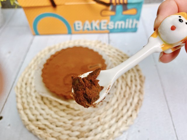 金莎生巧克力塔下層是榛果醬和榛果,中層是使用55%生巧克力做為柔軟的內餡,上層硬的是70%巧克力片,吃起來並不會過甜,可以品嘗到稍微偏苦的巧克力味