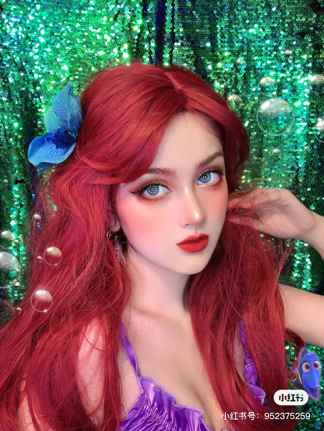 在仿妝部分為了呼應人魚公主的紅髮,在選擇妝容部分都以紅色調為主,並且加強眼眶的深邃度,讓整個眼眸看起來更加迷濛,如夢幻人魚般迷人又神秘!