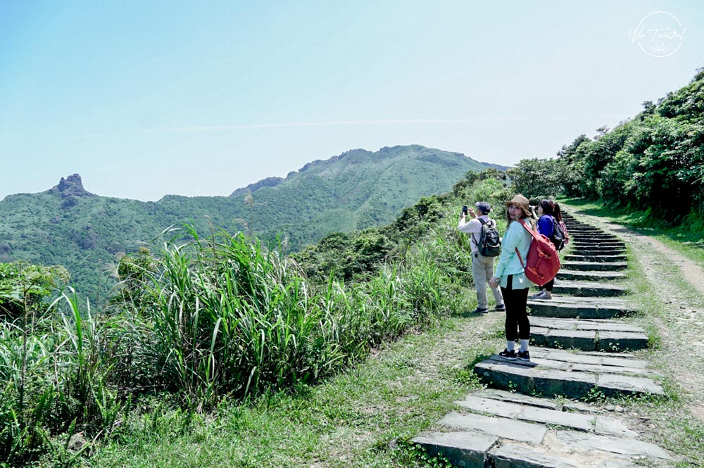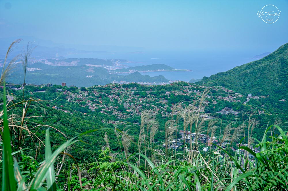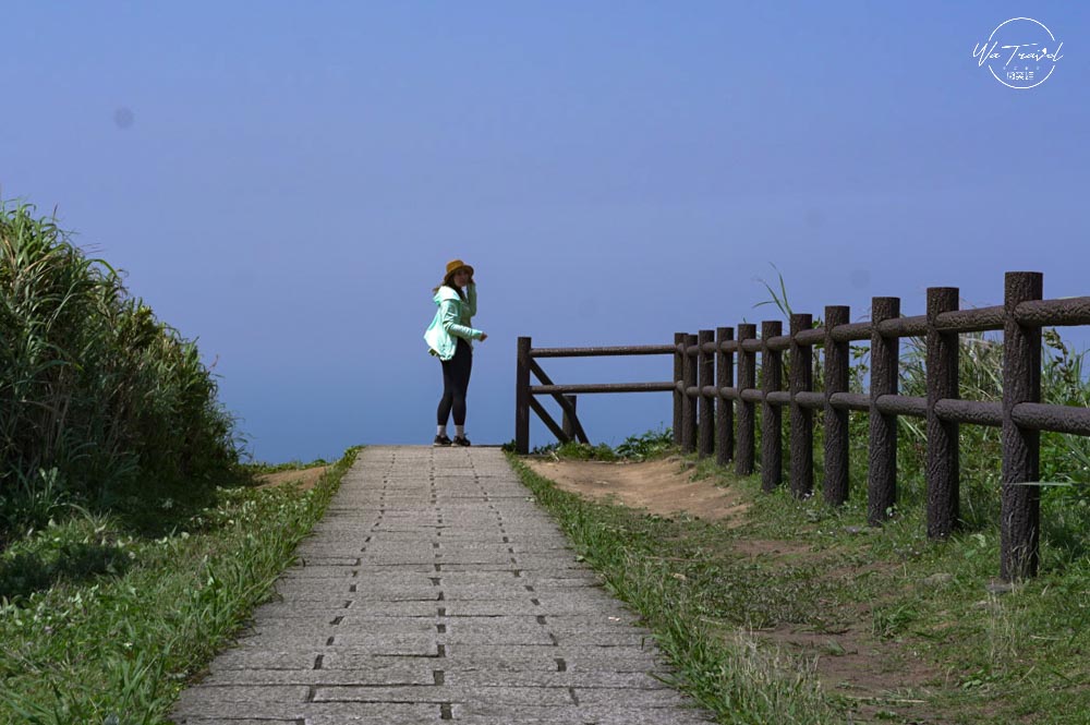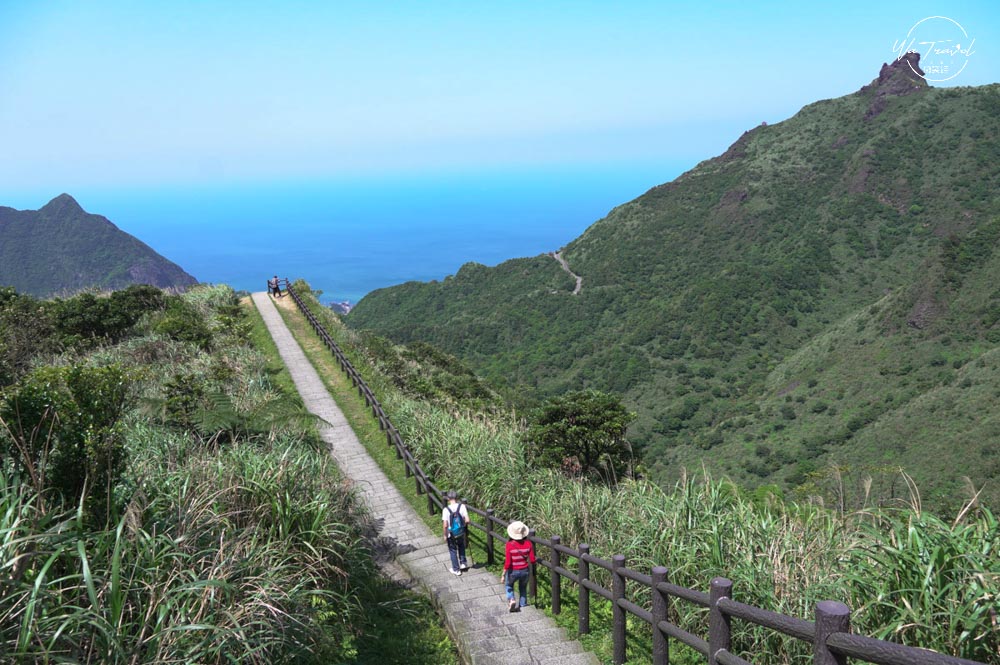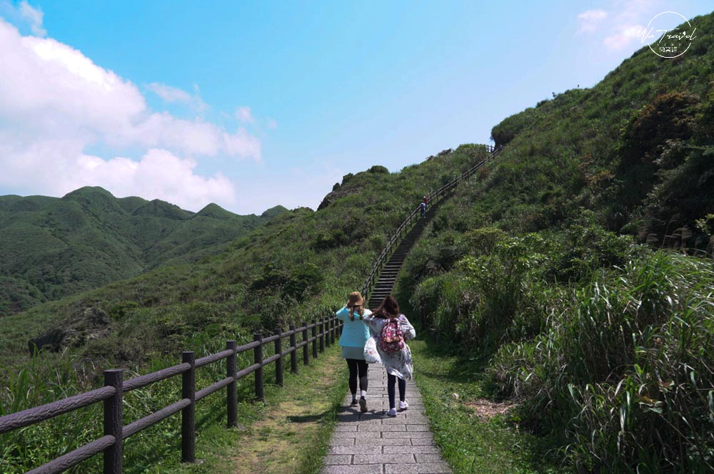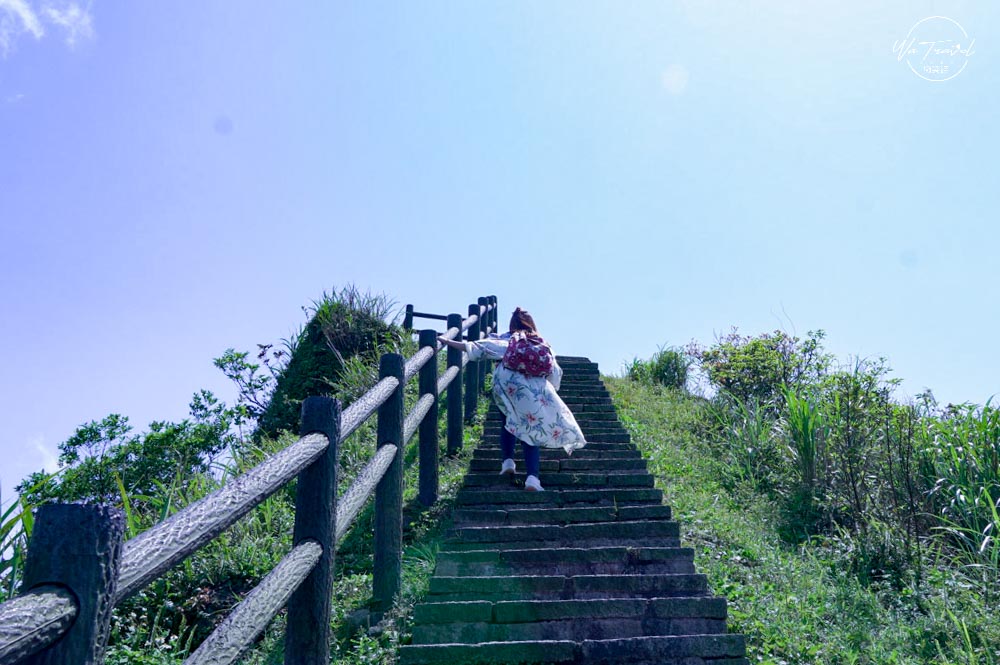 從草山步道爬上去後發現茶壺山旁的半平山連綿山脈恰似抹茶山,陽光照射下綠色亮麗,有一抹綠色美景,再從高處往下眺望樓梯就像斷崖一般沒有盡頭可以說是無敵海景步道,站在邊緣當天風超大令人感到腳底發麻。而整片的海景無垠,望著遠處看著海景心曠神怡;草山步道上還尚有一些芒草,若是秋季來此爬山可以看到連綿的秋日芒草,更具有一番風味,現在的時間來草山步道則是帶點微風徐徐,爬起來比較不負擔。