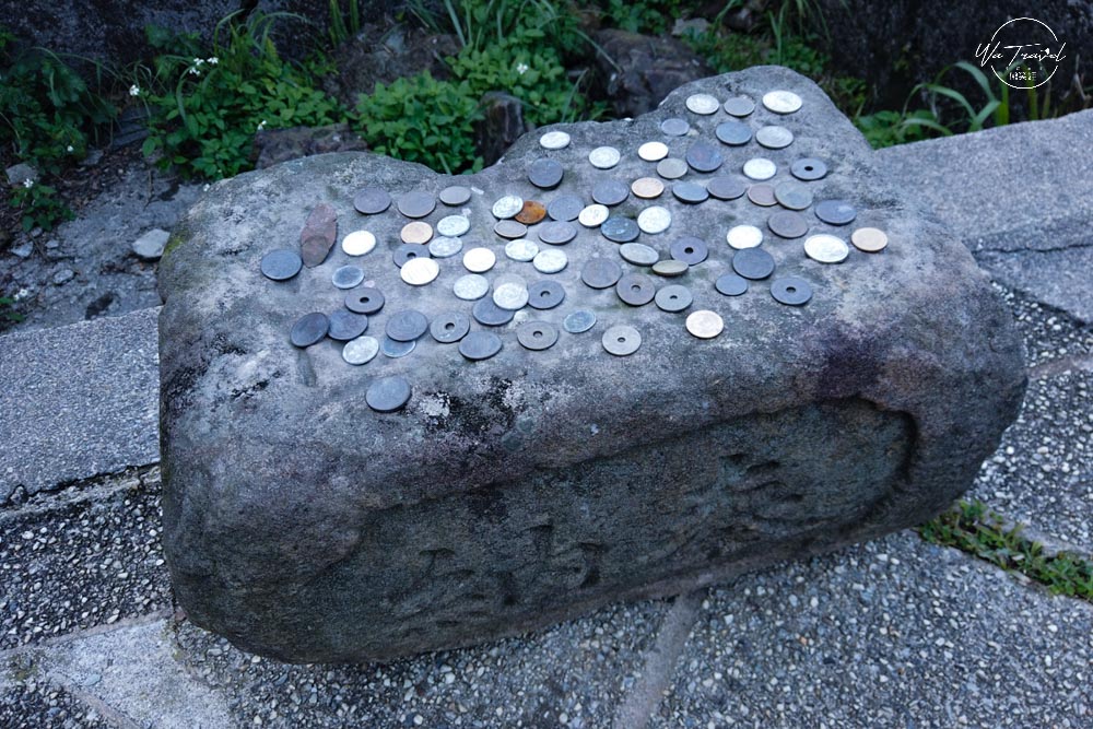 錢幣是放在納奉石上,主要是祈求神明保佑跟平安,除了一般的錢幣還有遊戲錢幣還有不少古錢幣,相當有趣。