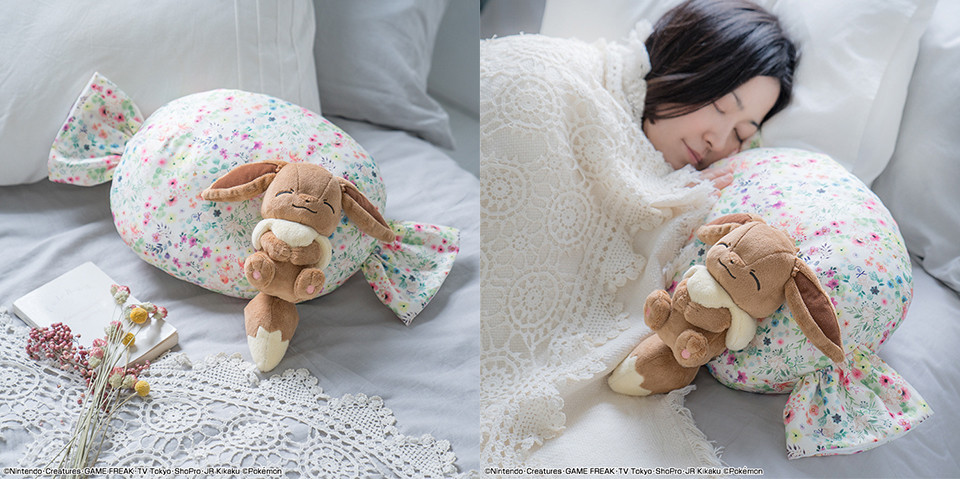 B賞是約35CM長的「伊布抱枕」,製作成糖果的造型,布樣使用碎花圖案,抱枕上還附有一隻小伊布娃娃,臉上一樣掛著幸福的微笑,整個看起來就像是躺在花堆裡做著美夢的伊布,完全萌到要讓人融化!睡覺時就讓療癒教主伊布來陪伴妳吧~