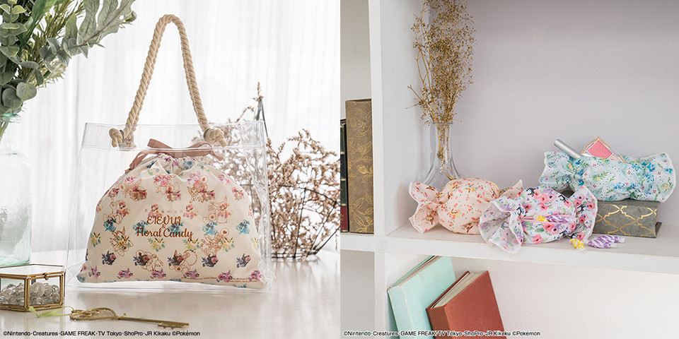 C賞是現在十分流行的「透明袋」,外層印有「EIEVUI&Floral Candy」的字樣與伊布家族的線條圖案,內袋則是滿版彩色的伊布家族造型,充滿了春天氛圍!D賞則是糖果造型的「化妝包」,有橘色系的伊布、紫色系的太陽精靈及水藍色系的水精靈三款,唯美花朵圖案最適合用來收納化妝品~