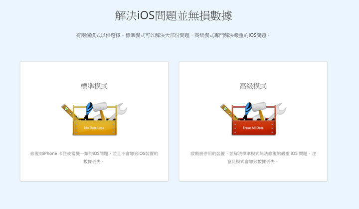 當滑鼠遊標移到按鈕上時,也會顯示該按鈕對應的詳細功能,像是「標準模式」就可自動化檢測 iOS 裝置的系統問題,並自動進行修復。