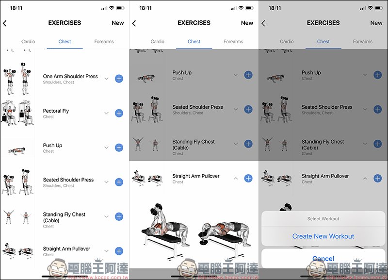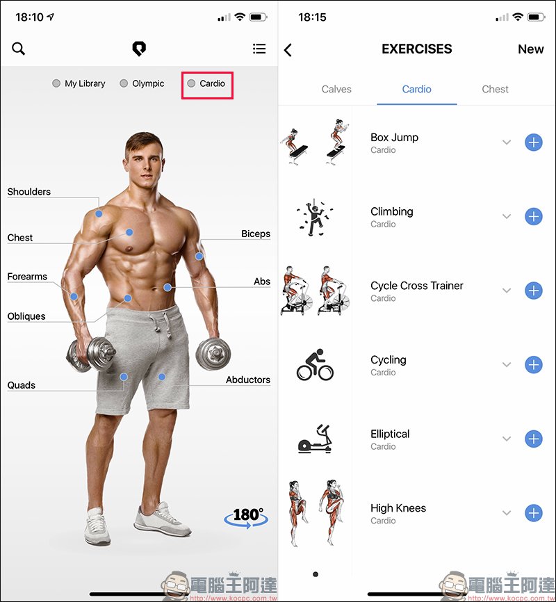另外,範例也會將該動作能鍛鍊到的肌肉進行標記,即便看不懂英文也不擔心。假如用戶想將該動作加入自身的健身課表,只要點選「+」即可添加:
