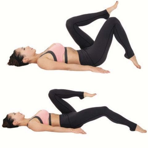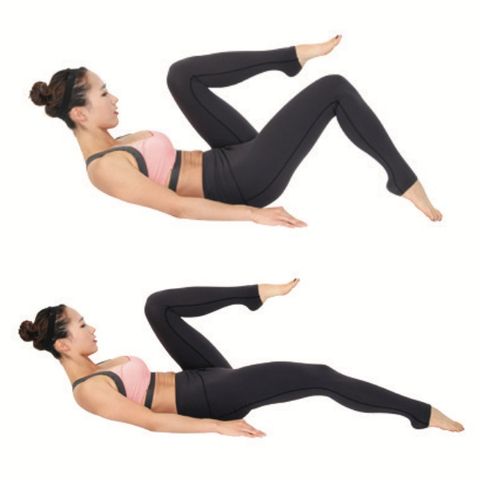 躺在地板上,彎曲膝蓋輕輕把腳抬起來。接著兩腳交替往地板輕點兩下再回到原位。點地板的時候要盡量把腳伸遠一點,可以給腹部帶來比較大的刺激。