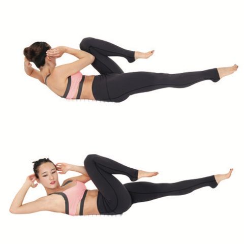 躺在地板上,膝蓋輕輕屈起,雙手貼在左右額際,或是十指交握輕輕撐著頭。彎曲的雙腳抬高至與地板成直角,用右手手肘去碰左手膝蓋、用左手手肘去碰右腳膝蓋,左右扭動身體。在做扭腰卷腹的動作時,注意伸直的腳不能碰到地板,扭腰的時候腹部要用力,讓身體不會有過大的晃動。