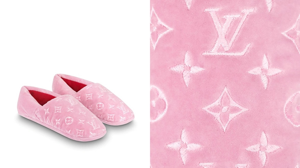 舒適度最佳選擇則是它~「DREAMY家居式拖鞋」以柔軟的絲絨繡上Louis Vuitton經典老花, 搭配的柔軟的內裡及絕佳的包覆性,讓你在家也能時尚與舒適兼具。