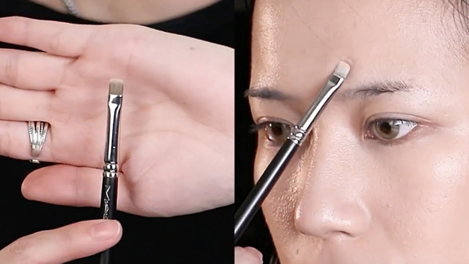 扁平的遮瑕刷其實沒辦法做好很好的暈染,所以在針對局部的膚色不均、或是黑眼圈遮瑕,彩妝師建議以刷毛較短的「眼影暈染刷」來上遮瑕,讓遮瑕更融合底妝。