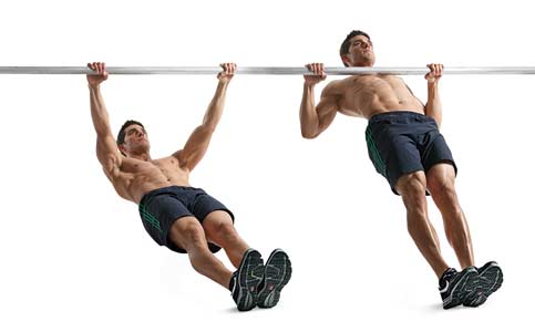 這個動作其實與「槓鈴划船」極為相似,但是與利用槓片負重不同的地方在於,這裡使用的是自身體重來進行訓練。你可以尋找一個高度適中(約腰部高度)的單槓,或者是利用健身房裡的史密斯機、深蹲架來進行。可以透過改變身體傾斜的角度來調整訓練的難度,當身體與地面形成的夾角愈小、難度愈大。