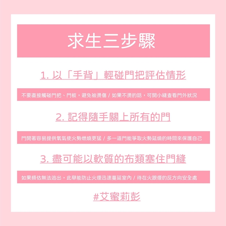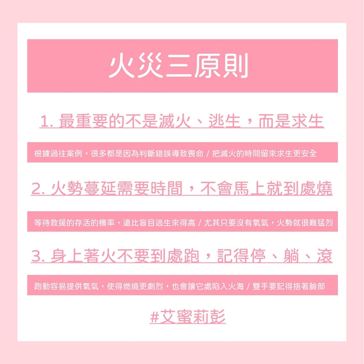 最後這三個原則也請大家告訴周遭親友們!防災專家林金宏曾在演講中多次提及,在火場最重要的是「求生」而非「逃生」和「滅火」!根據以往案例,在不具備火的相關知識時,貿然逃生、滅火,不僅很危險,還極可能讓自己喪命!