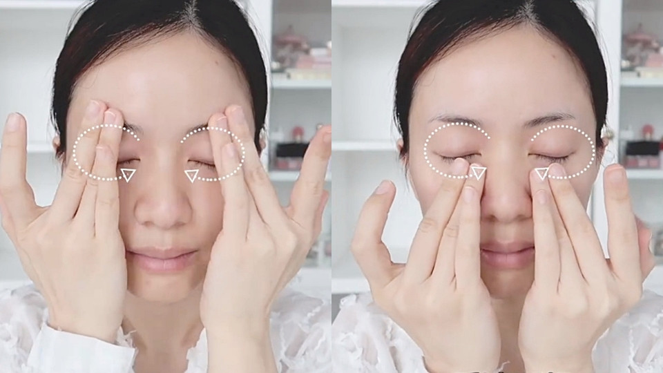 以手指「逆著」眼周細紋的生長方向,點、壓打圈按摩,讓眼霜可以更被眼紋吸收,按摩約三圈左右即可。