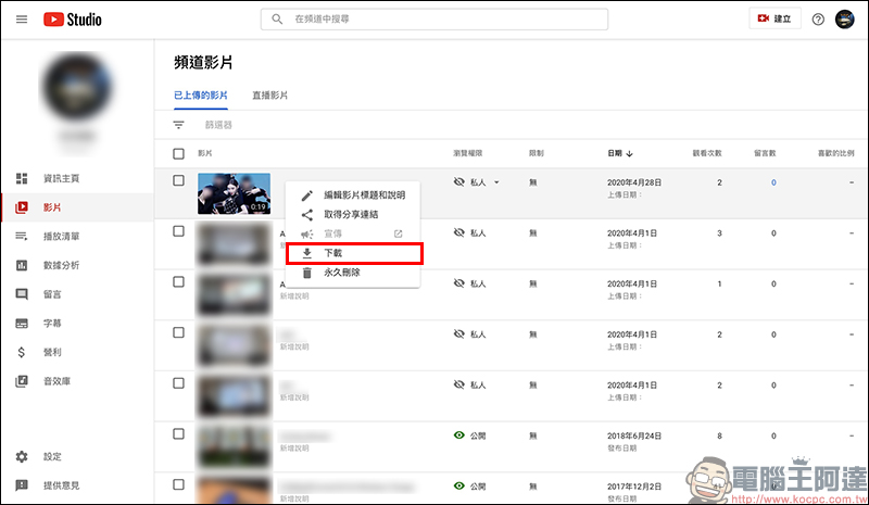 YouTube 工作室後台,除了有豐富的音效庫可使用。其實也內建的模糊效果的編輯功能讓有人臉模糊需求的創作者,快速完成人臉打碼工作。若後續還有其他影片剪輯工作,建議先將影片上傳到 YouTube 並選擇「私人」權限,接著在完成人臉打碼再將該影片下載到電腦繼續完成進一步的影片剪輯。