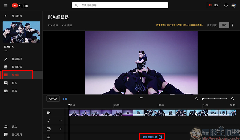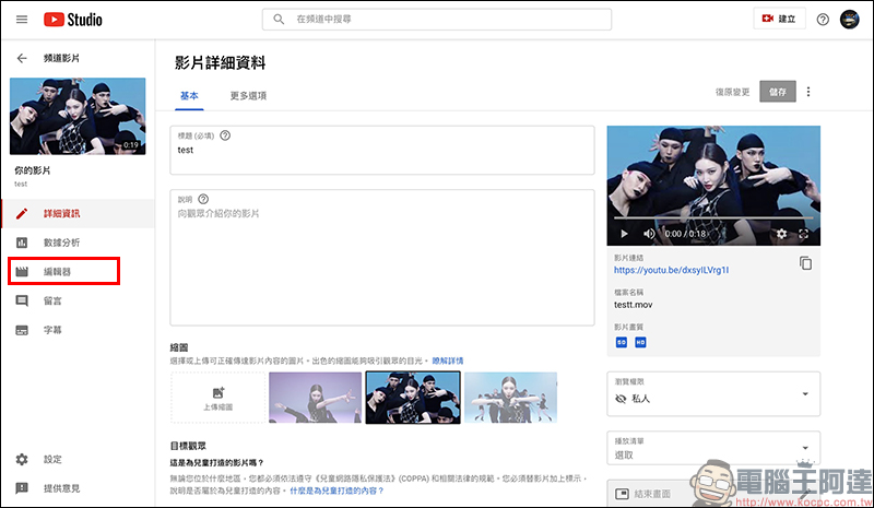 上傳影片後,從 YouTube 工作室後台點選該影片進入影片詳細資料頁面,接著選擇畫面左側的「編輯器」: