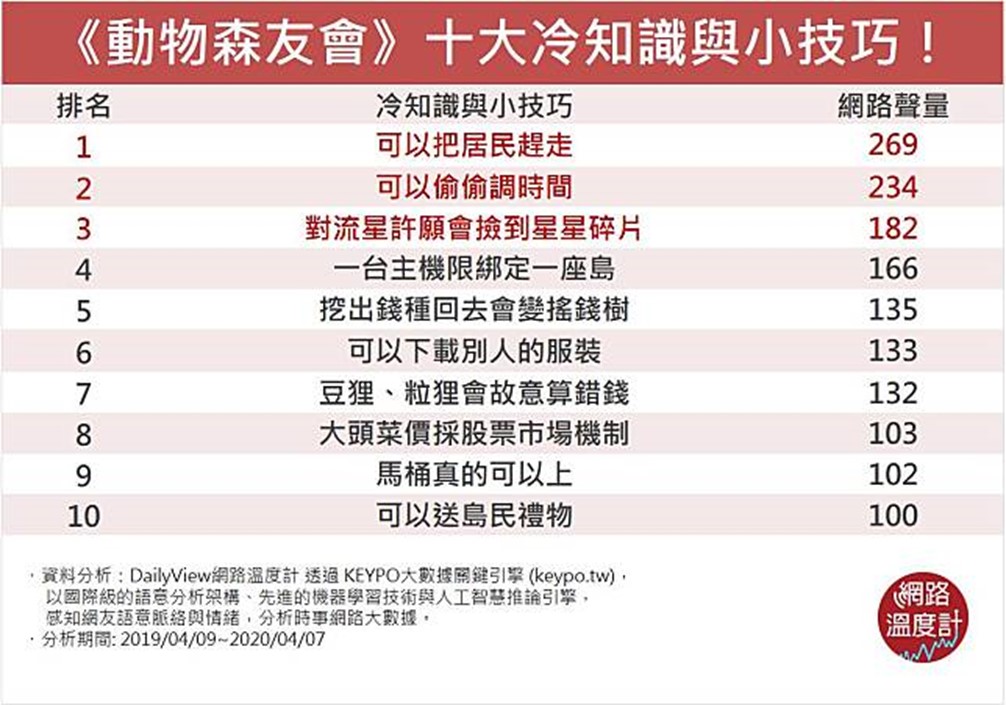 根據《DailyView網路溫度計》的《KEYPO大數據關鍵引擎》調查報告,整理出10大網友們最常討論遊戲中的冷知識及小技巧,包含如何把居民趕走、如何偷偷調時間、對流星許願撿到星星碎片...等等。