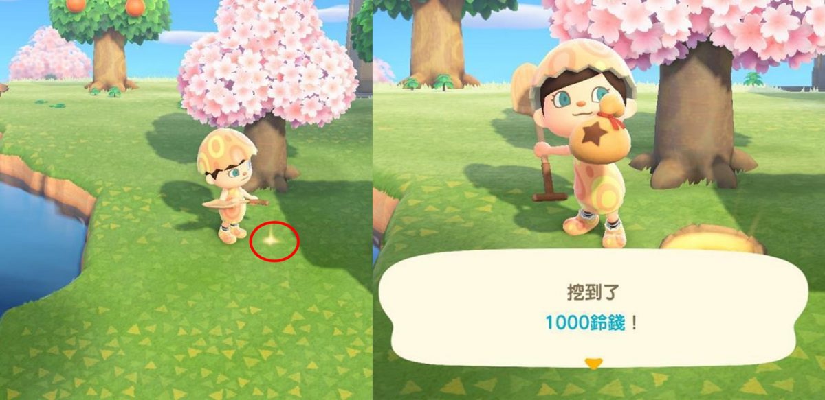 本島上每天會有某處的地面發光,只要用鏟子往下挖,就會挖到鈴錢$1000。