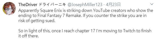 這樣經典的作品重出江湖,自然也吸引了不少遊戲實況主及影片創作者的目光,許多實況主紛紛開啟直播實況,與粉絲們共同在全新的FF7世界中破關闖蕩。然而,這樣的舉動在遊戲公司史克威爾艾尼克斯眼中,卻是一種要不得的「劇透」行為?