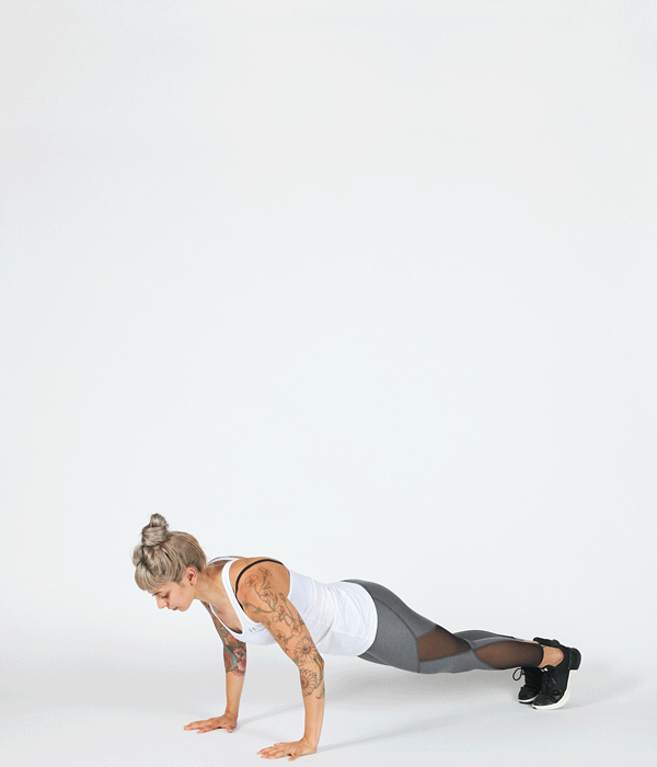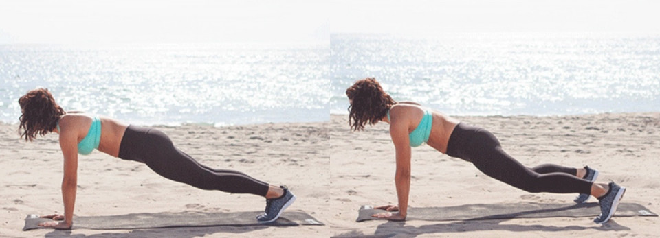 像是這款變化動作,是在棒式撐體後加入了一次伏地挺身。但這邊我們可以適度的調整難度,初學者可以直接趴在地面上,再撐體做跳躍;中階者可以做1次伏地挺身;進階者可以增加次數到3次,但不要次數過多以免力竭,容易受傷。