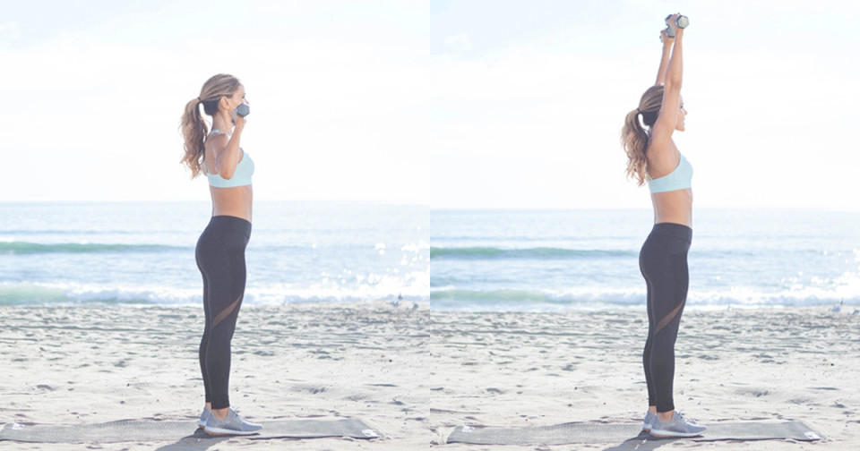 啞鈴肩推是很棒的雕塑手臂運動,單做肩推是可以甩開蝴蝶袖的。而搭配上波比跳跳,則可以多鍛鍊到我們胸部與肩部的肌肉群,讓瘦身更全面性。