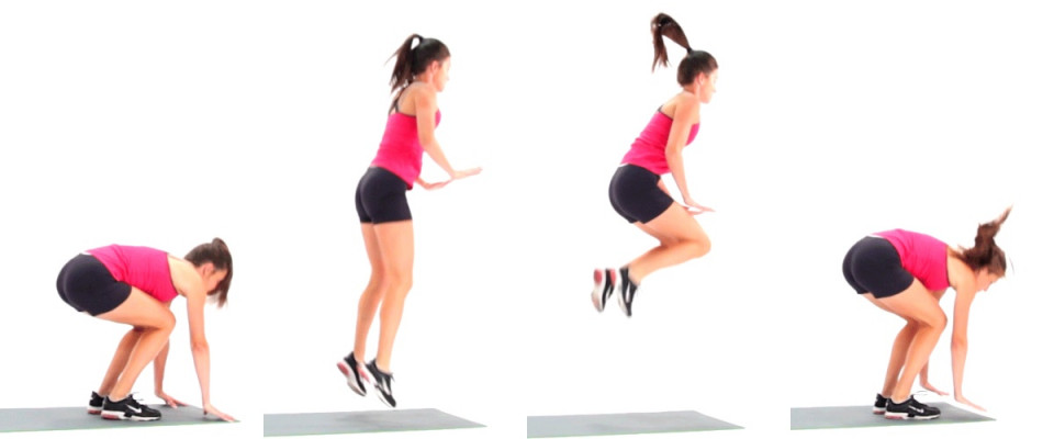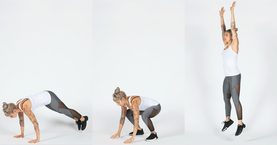 撐地棒式(上圖)+深蹲跳(下圖)所組成的連續動作,就是基礎款的波比跳。這兩個動作分開運動很適合當做暖身運動,另外對於過度肥胖、關節有傷等人,可以單純做這兩個拆解動作即可,不勉強做波比跳避免受傷。
