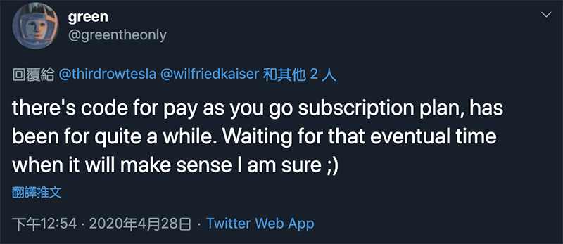 這個功能伏筆之所以引起討論,是因為在透過軟體付費解鎖功能方面其實 Tesla 本來就玩得相當透徹,而隨著 FSD 輔助自動駕駛功能的解鎖價格預期將越來越高,可以在買斷模式之外,開始將幾家科技公司流行使用的付費訂閱模式納入,也有望會成為 Tesla 未來的策略之一。