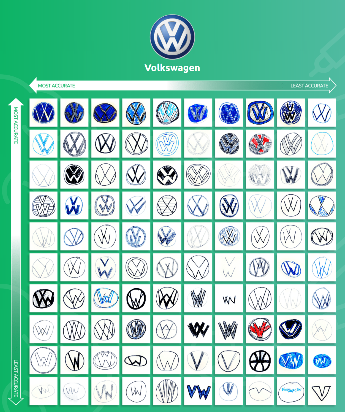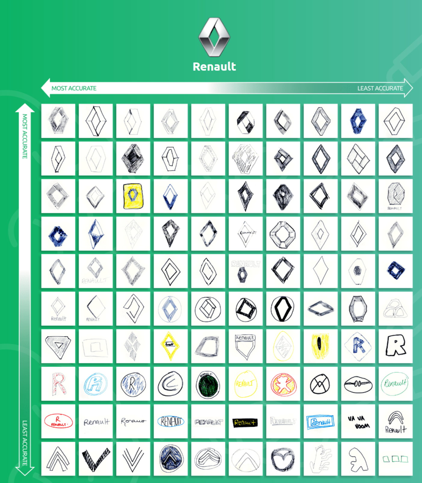人的眼睛與腦袋都比不過機器,就算是老司機也不見得可以把隨堂抽考的汽車品牌描繪的完美。英國最大的二手貨車零售商Van Monster 找了54名女性與46名男性年齡不拘共100位測試者,只告訴品牌名稱請他們將logo畫出來,分別是BMW、奧迪、福特、雷諾、愛快羅密歐、福斯、法拉利、標緻、佛賀、豐田等。最後結果在共1000張的圖紙上約80%的使用正確的顏色、78%能夠描繪正確的形狀,但若是連細結都交待清楚的大約只有12%;而logo愈簡單則正確率愈高。