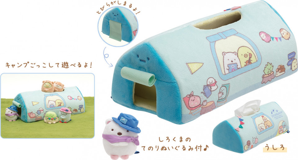 第四款是帳篷造型的「面紙套」,面紙套上印有角落小夥伴的露營生活模樣,還可以看見窗戶裡的白熊、企鵝,看著看著好像也能感受到角落小夥伴們的愜意呢~旁邊的門也有可以捲起或放下的的設計,還附有一隻小白熊娃娃,而且不但可以當成面紙套,也能用來收納娃娃,這款真的鐵粉必收藏!