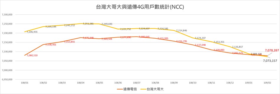 根據NCC公布的"4G用戶最新統計資料",統計到2月底,遠傳電信以7,078,397戶首次超越台灣大哥大的7,073,157戶,首次躍居電信二雄位置。