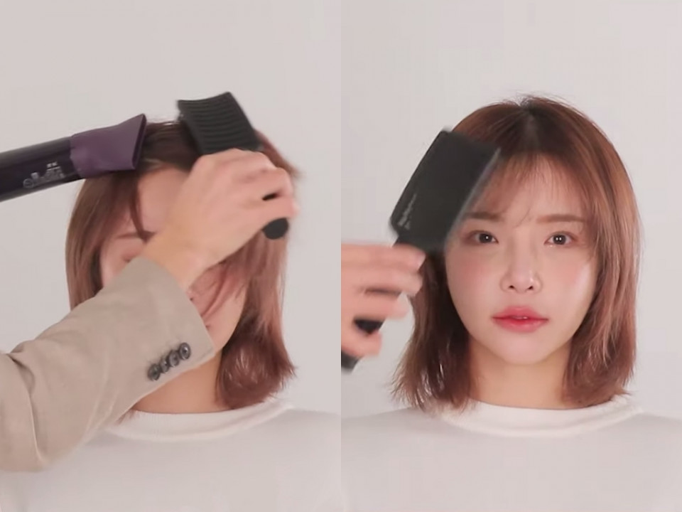 一樣用寬版梳順著瀏海往下拉、吹出一個弧度即可,瀏海就吹整完成。
