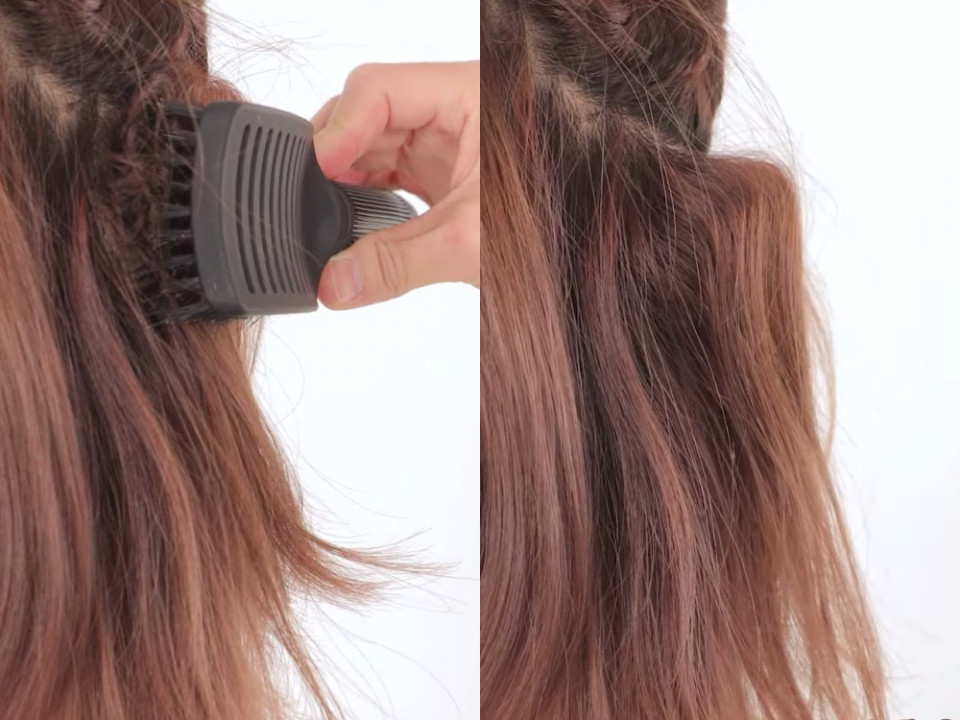 先將頭髮分層,以寬版梳壓住髮根後、再向上推,用吹風機對著壓出的摺痕吹整。