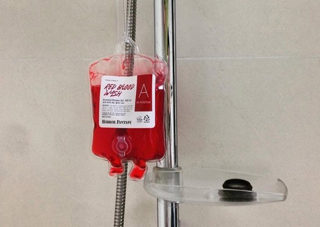 「血袋沐浴乳」裡頭裝的是鮮紅色帶有玫瑰香味沐浴乳,特別設計一個塑膠圈環可以讓你掛在牆壁上,洗澡時則可以選擇掛在蓮蓬頭上彷彿身處於醫院,可惜目前只推出A型血,所以想要買其他血型的女孩再等等喔!