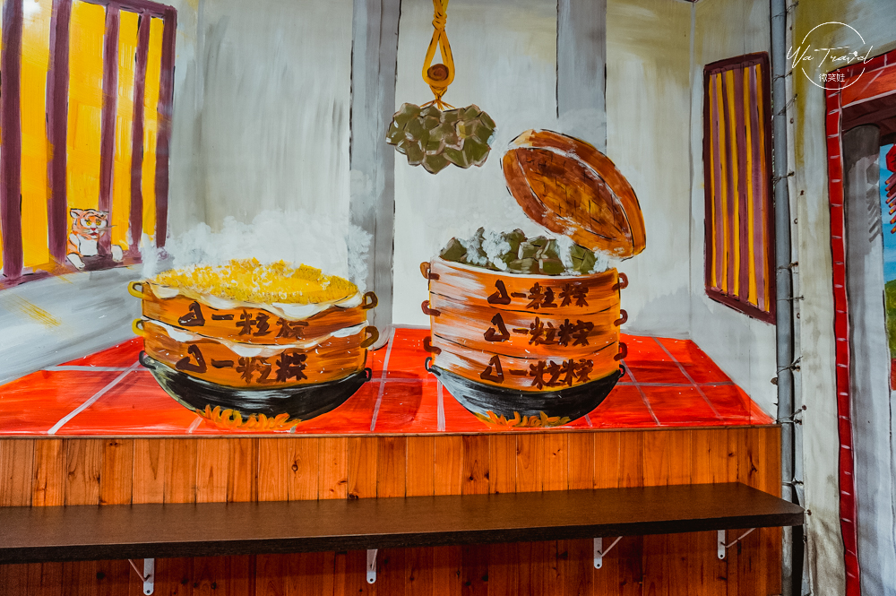 我們依照自己的步調先到了一粒粽想要享用美食,大量的肉粽,只剩下「桂花粽口味」、「干貝粽口味」,感覺老闆娘(不知道是嗎?)心事重重,我們點了一顆桂花粽跟魚丸湯現場享用,座位區離販售區隔一段距離,這裡都採自助式買、取、丟!座位區有可愛的石碇站牌寫著一粒粽!整個空間都是滿滿的彩繪,相當可愛!一粒粽吃起來桂花香味濃郁,但意外的小顆!我應該可以吃更多。