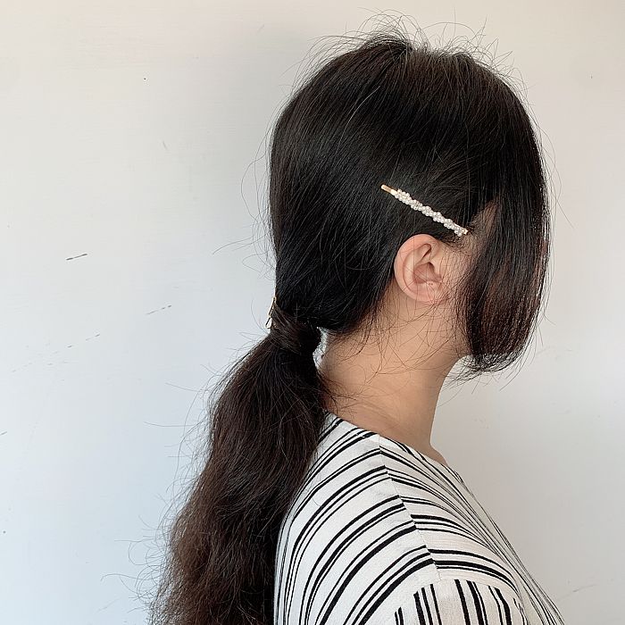 跟剛剛的夾法不太一樣,是直接在側邊的頭髮平夾上去,看起來更淑女了,特別適合搭配有小珍珠點綴的款式低馬尾耳上斜夾x造型髮夾