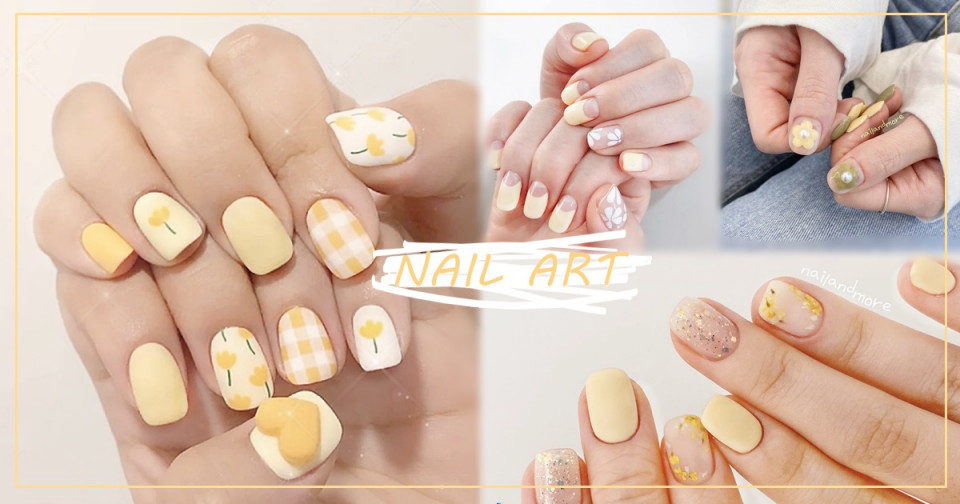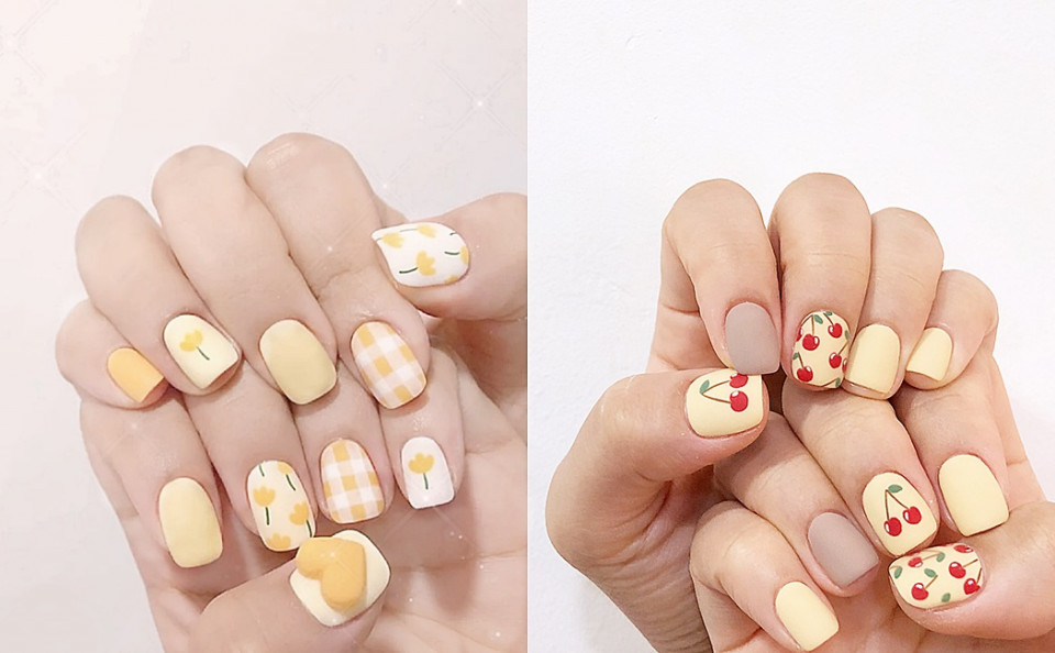 可愛又清新的手繪風絕對是奶黃色美甲最好的搭配元素!除了很常見的手繪小花之外,也可以搭配可愛水果、卡通人物等元素~如果擔心太浮誇,可以做成霧面美甲,看起來不失特色卻又不會太浮誇!如果想要多點層次感,可以請美甲師搭配不同明度的奶油黃色,就會超特別~