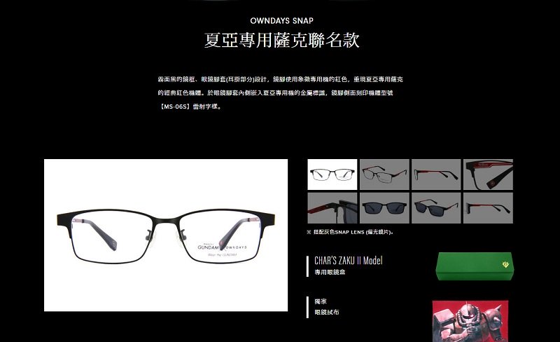 在「夏亞專用薩克聯名款」經典配色眼鏡中,OWNDAYS選定具備吸附式磁鐵設計的SNAP LENS,裝在專用鏡框上即可輕鬆替換成太陽眼鏡,眼鏡品牌「OWNDAYS SNAP」作為商品款式,而「夏亞專用薩克聯名款」,採霧面黑的鏡框、眼鏡腳套(耳掛部分)設計,鏡腳使用象徵專用機的紅色,重現夏亞專用薩克的經典紅色機體。眼鏡腳套內側嵌入夏亞專用機的金屬標識,鏡腳側面刻印機體型號【MS-06S】雷射字樣,有專用眼鏡盒與眼鏡拭布。