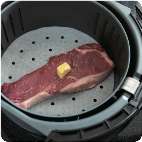 步驟2. 將沙朗牛排放入氣炸鍋籃,放上一半的無鹽奶油,先以160℃炸五分鐘