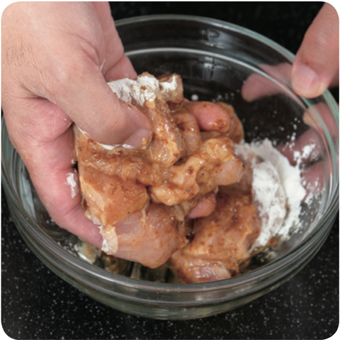 步驟2. 將雞肉和醃料混合醃30分鐘,醃好的雞肉沾上炸粉放置5分鐘
