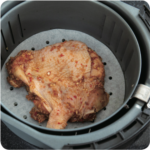 步驟3. 將醃漬過的雞腿放入氣炸鍋籃,噴塗適量橄欖油,先以180℃炸12分鐘