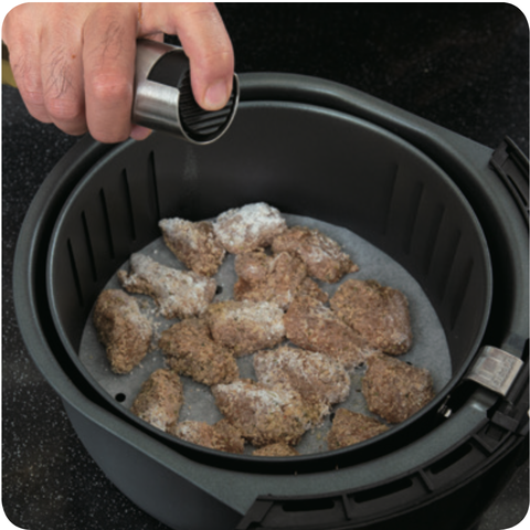 步驟3. 將雞肉放入氣炸鍋籃內,正反面噴塗適量橄欖油