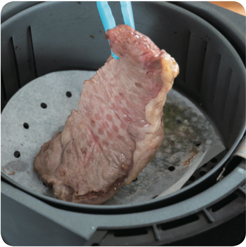 步驟2. 將沙朗牛排放入氣炸鍋籃,放上一半的無鹽奶油,先以160℃炸五分鐘