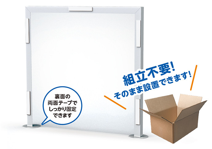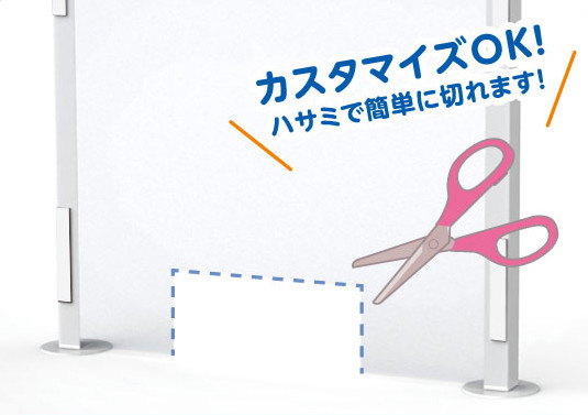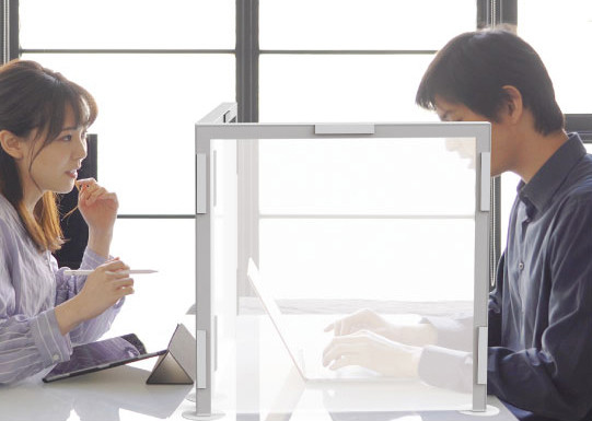 日本辦公室用品廠商推出一系列尺寸的隔板,無需組裝只要把PE膜上的磁鐵固定在架子上即完成。採用耐化學性能的PE板,可以使用消毒劑消毒,若有特殊需求的話,下方也可以自己剪一個窗口出來當鋪。