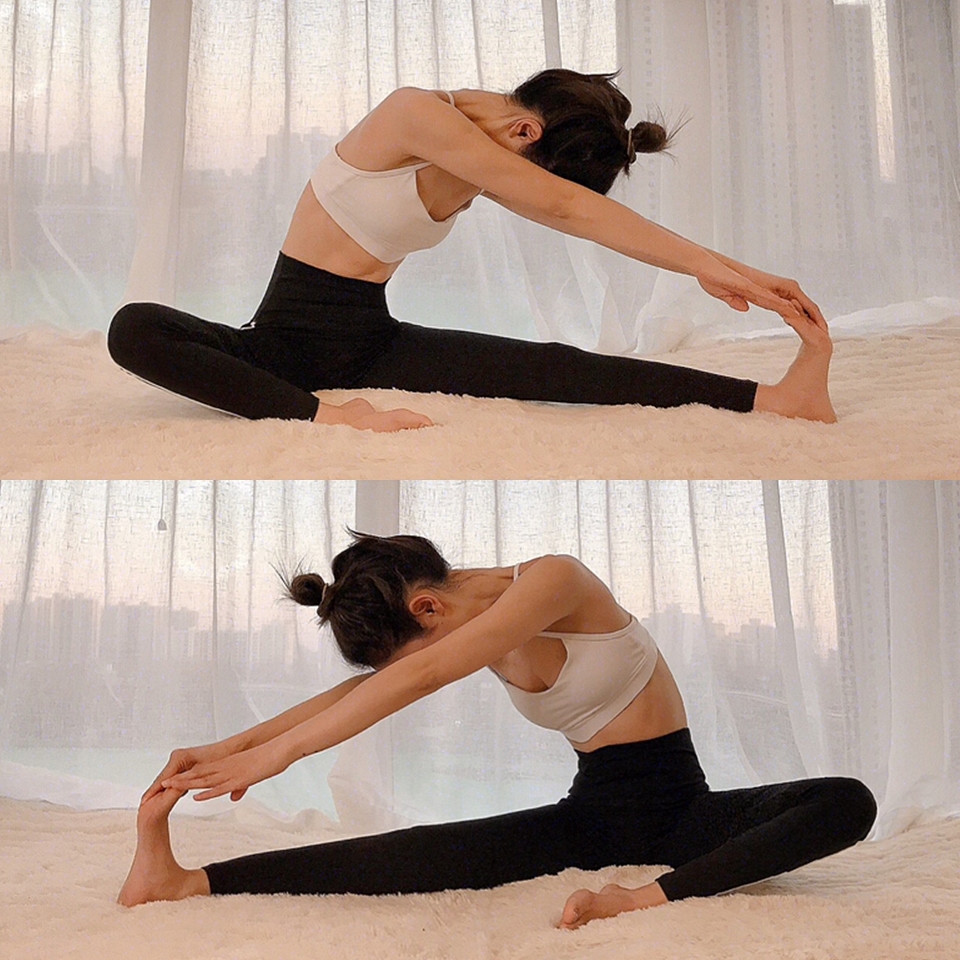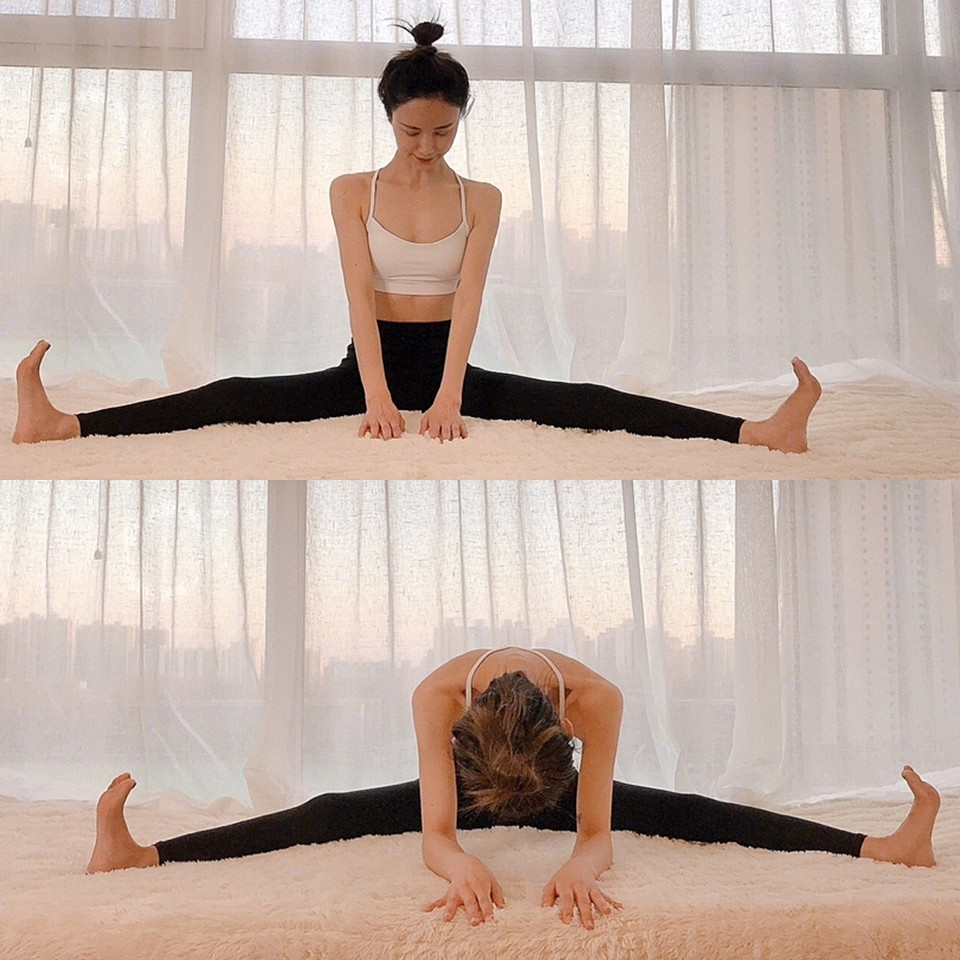 雙腿盡量打開到最大,將腿盡量伸直下壓、腳尖上勾,想要增加效果或是柔軟性較好的人可以再將身體往前俯身,伸展效果會更高,可以充分伸展腿後側和內側肌肉,讓大腿內側更緊緻,停留約1分鐘即可。