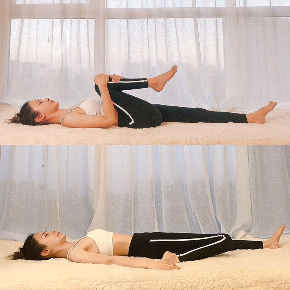 平躺在地,雙手抱膝、將大腿前側靠近腹部,左右停留30秒,接著換成將腿屈膝、腳後跟在臀部外側,一樣左右停留30秒,這個動作可以伸展大腿前側及外側,使大腿前側肌肉更細長。