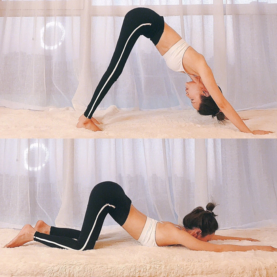 這個動作就是瑜伽的下犬式,是經典的全身伸展動作、特別對於腿部後側的肌肉有拉長伸展的效果,以雙手、腳掌撐地,全身呈V字停留30秒即可。